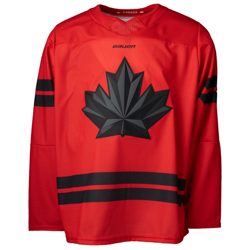 This semi-pro model features 100% polyester construction, fully sublimated striping, and official embroidered Bauer and Hockey Canada branding.