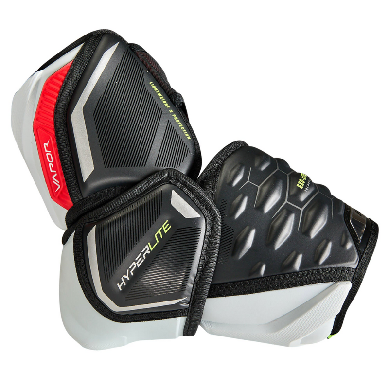 Bauer Vapor Hyperlite Hockey Elbow Pads - Senior (2022) redefine agility and protection with EXO-Lite Skin forearm guards and a 3-piece molded cap for lightweight, high-impact defense. The THERMOCORE ZERO liner wicks moisture to keep players dry, while Hyperlite HD foam in the bicep guard absorbs hard hits. A 360 Forearm design with EXO-Lite Skin ensures full coverage, and the Dynaflex strap secures a snug, ergonomic fit for unrestricted mobility during fast-paced play.