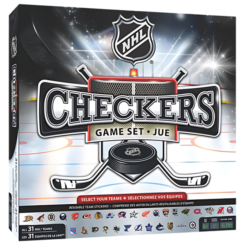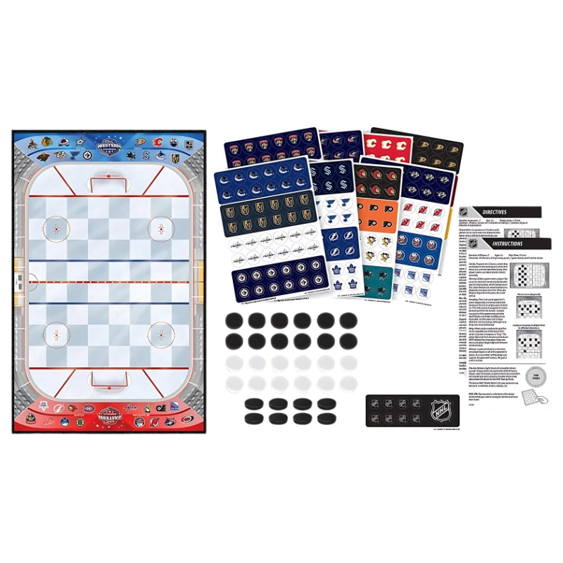 Bring hockey excitement to game night with the NHL League Checkers Board Game, featuring a detailed NHL arena game board and team-branded sticker sheets for all 31 franchises. Classic checkers gameplay gets a sporty twist with black/white puck-inspired pieces, and crowning your king rewards you with a whimsical hockey puck king piece. Perfect for ages 6+, this 2-player battle combines strategy and team pride in under 15 minutes.